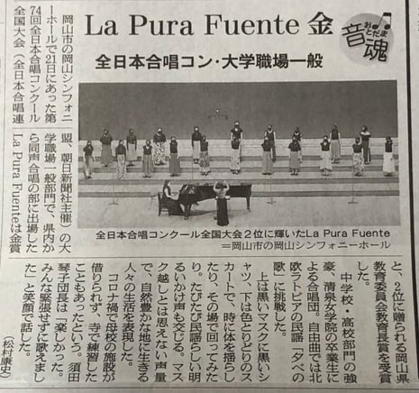 ラ・プーラ・フェンテ活動報告11月21日岡山市で開催の第74回全日本合唱コンクール全国大会・大学職場一般部門で、La Pura Fuenteが金賞と岡山県教育委員会教育長賞を受賞しました♪
