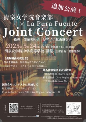 5月5日(月)、鎌倉芸術館にて清泉女学院音楽部 とLa Pura Fuente のジョイントコンサートを開催いたしました。53期生から80期生まで、あたたかな雰囲気のなか演奏させていただき、大変幸せな時間となりました。